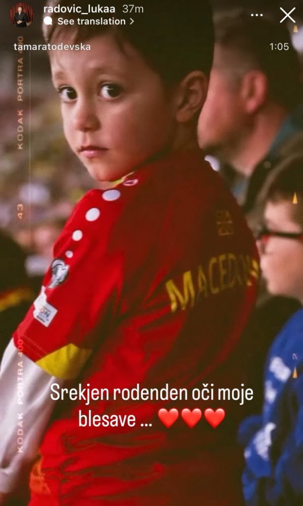 „Среќен 7-ми роденден, сине. Од првиот здив знаев дека ти си МОЕТО СРЦЕ надвор од мене. Со тебе ЉУБОВТА доби ново значење, а секој ден е полн со СВЕТЛИНА. Биди СРЕЌЕН И ЗДРАВ