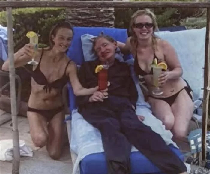На фотографијата, Хокинг лежи на лежалка покрај две млади жени во бикини. Познатиот научник, кој боледуваше од екстремно прогресивна невромоторна болест – амиотрофична латерална склероза (АЛС) и беше во инвалидска количка повеќе од 50 години, почина во 2018 година на 76-годишна возраст.