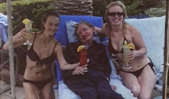 На фотографијата, Хокинг лежи на лежалка покрај две млади жени во бикини. Познатиот научник, кој боледуваше од екстремно прогресивна невромоторна болест – амиотрофична латерална склероза (АЛС) и беше во инвалидска количка повеќе од 50 години, почина во 2018 година на 76-годишна возраст.